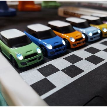Rent out these Micro RC cars for your next birthday party or gathering of friends or family. We provide you with 6 of them and a large modular track that can be configured in any shape desired. Perfect for a kitchen table. They are about the size of Matchbox cars. Don't let the small size fool you though, they are hobby grade RCs with fully proportional steering and throttle.