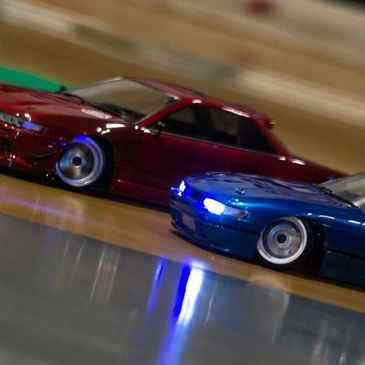 Party Crashers partners with another person to offer these for you. Availability would have to be confirmed. The RC Drift Cars are about 13" in length. They will set up a complete track to drift around. Concrete works best, but pavement and office carpet would work too. The standard size for this track is 20'x30', but they can adapt.